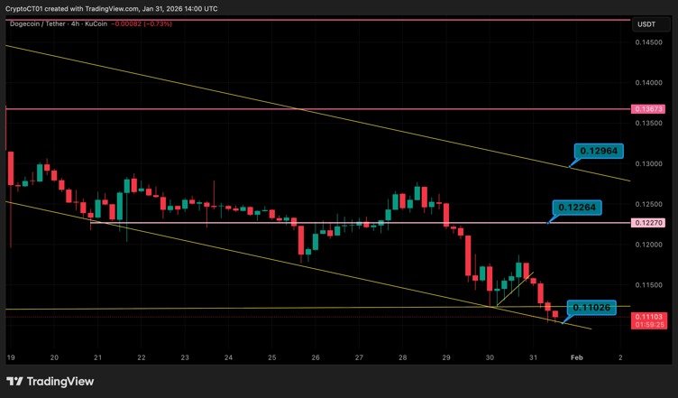 Dogecoin (DOGE) is currently testing a support trend line around $0.11, a level that will be closely watched by traders in the near term. If this support holds on the four-hour candlestick, price could see a modest rebound toward nearby resistance levels, suggesting measured upside potential. At the same time, a breakdown below this key level could open the door to further consolidation. While DOGE remains a recognizable and widely held asset, its short-term movement appears relatively contained, highlighting why some investors are exploring new crypto coin Mutuum Finance, which could be the next crypto to explode in 2026.